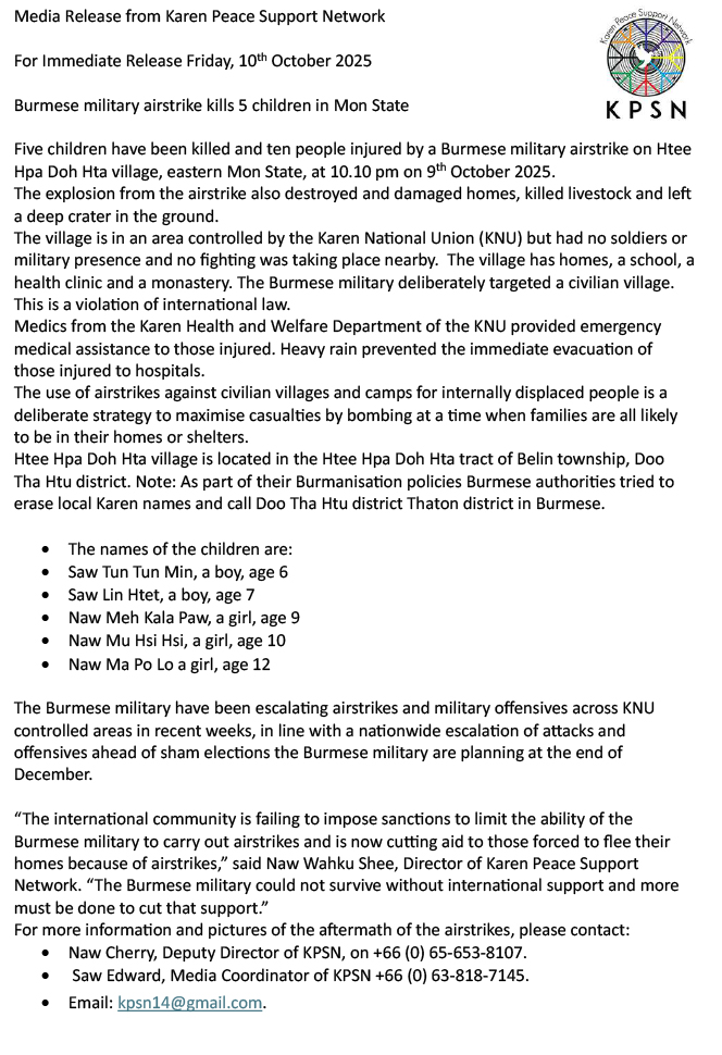Press Release: Burmese Military Airstrike Kills Five Children in Mon State October 11, 2025 By Download English version Download Burmese version